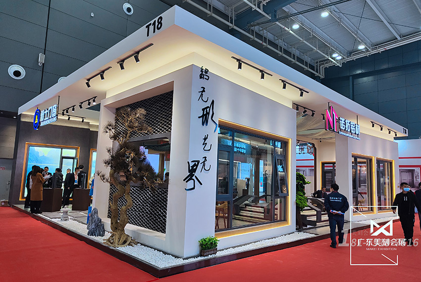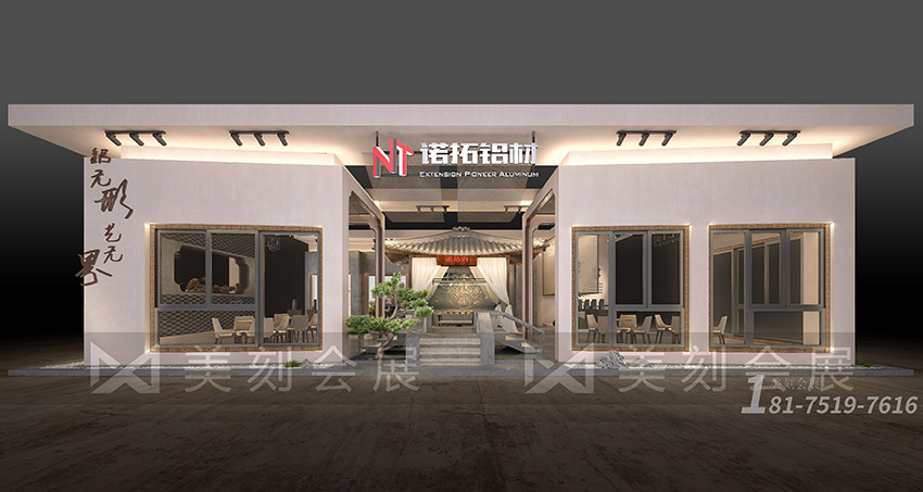 美刻會展根據(jù)諾拓鋁材“鋁無形,藝無界”的理念,在展臺設(shè)計時用空間與藝術(shù)融合,最終搭建出回溯自然、出入古今的展臺。話不多說,讓我們直接看一幅極有畫意的展臺: